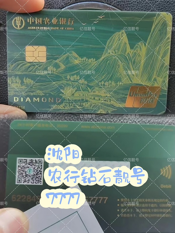 恭喜神秘朋友不远千里来到美丽的沈阳顺利办理农业银行钻石卡靓号尾数7777。大家都知道,农行储蓄卡一共分为普卡,金卡,白金卡,钻石卡几个等级。越往后,对客户的存款要求越高,相应的卡片发型数量也越少,出现靓号卡的概率也就月底。可谓是天时地利人和缺一不可。农业银行普卡最近推出了网上申请靓号,可以选择后4位卡号,例如:4444/0001/3456/9876等类似的靓号卡。其他的卡种均不支持银行卡号的个性化定制。